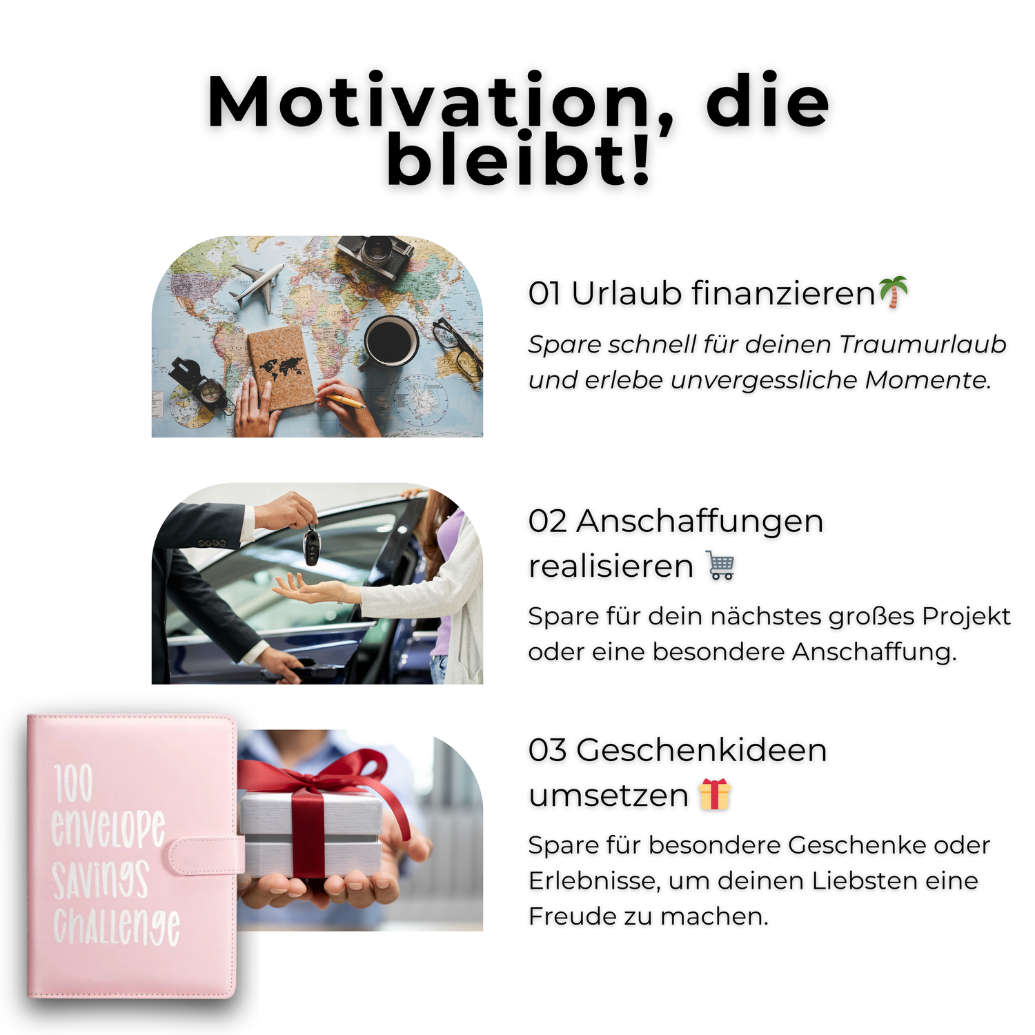 Mit unserem 100-Tage-Challenge-Ordner wird Sparen zum Kinderspiel. Ob du dir einen lang ersehnten Wunsch erfüllen oder einfach einen finanziellen Puffer aufbauen möchtest – dieses System begleitet dich Schritt für Schritt.